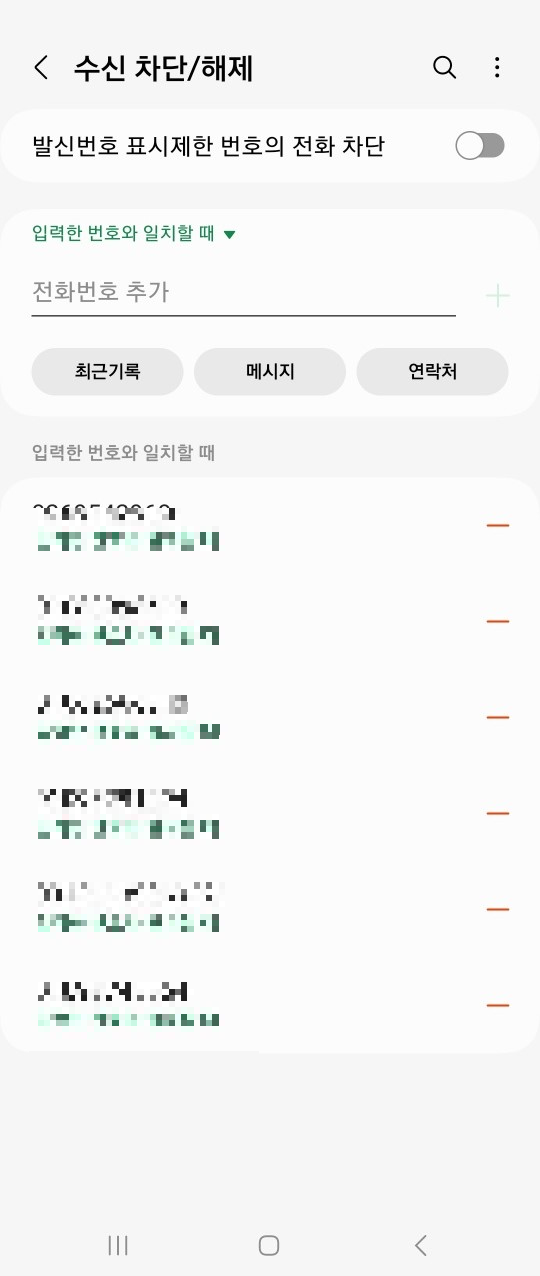 마지막으로 위에 있는 발신번호 표시제한 번호의 전화 차단을 눌러주면 더이상 발신번호 표시제한 전화는 오지 않게됩니다. 추가로 원치않는 전화 또는 스팸전화를 차단하려면 위와 보이는것처럼 연락처를 입력하여 차단을 할수가 있게됩니다.